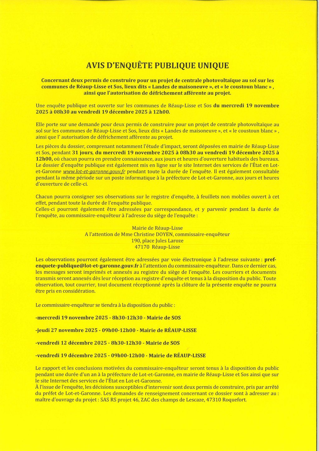 Veuillez trouver ci-joint un avis d'enquête publique unique concernant deux permis de construire pour un projet de centrale photovoltaïque au sol sur les communes de Réaup-Lisse et Sos, lieux-dits "Landes de maisoneuve" et "le coustoun blanc", ainsi que l'autorisation de défrichement afférente au projet.
