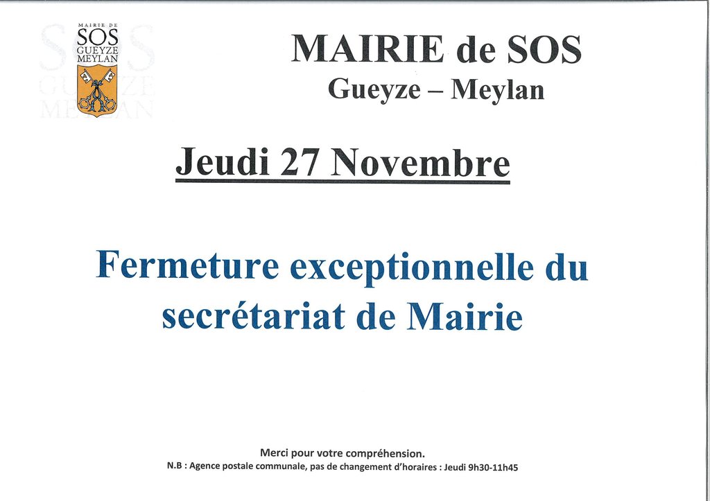 JEUDI 27/11/2025 - FERMETURE SECRÉTARIAT DE MAIRIE