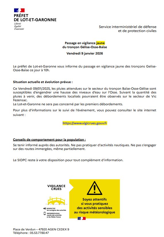 Le préfet de Lot-et-Garonne vous informe du passage en vigilance jaune du tronçon Gelise-Osse-Baïse ce jour à 10h.