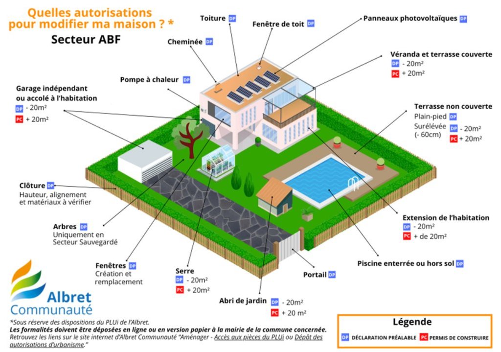 Les formalités varient en fonction de la nature des travaux et de votre secteur d'habitation (secteur protégé par les Architectes des Bâtiments de France " ABF" ou non). CF. schémas.
