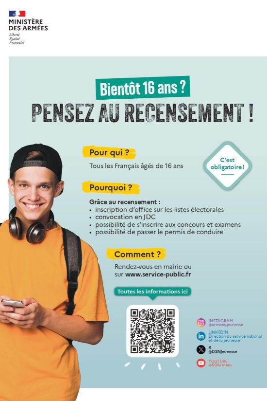 Le recensement citoyen est obligatoire. Il permet d’obtenir une attestation de recensement, d’être convoqué à la Journée défense et citoyenneté (JDC) et d’être inscrit automatiquement à 18 ans sur les listes électorales.