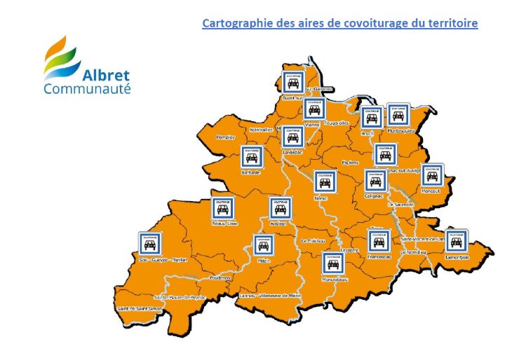 Afin de faciliter le covoiturage au quotidien, près de 14 aires de covoiturage ont été aménagées en Albret dans les communes suivantes :
