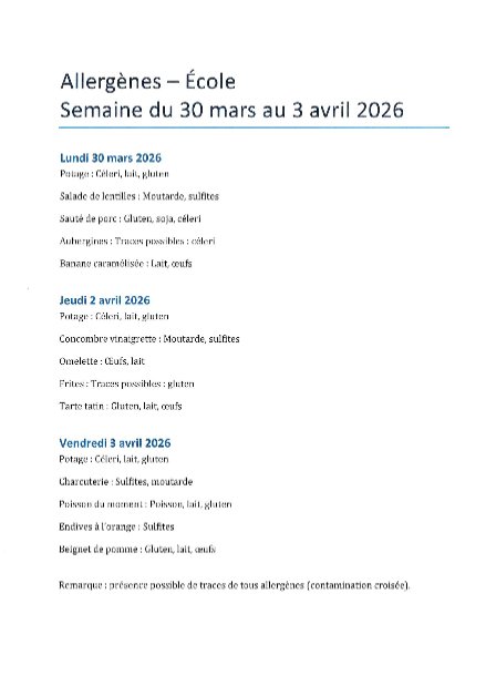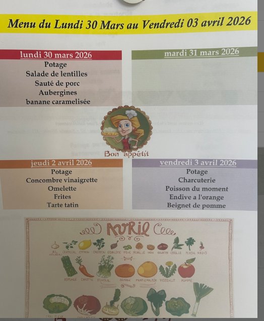 MENU CANTINE DU 30 MARS AU 03 AVRIL 2026