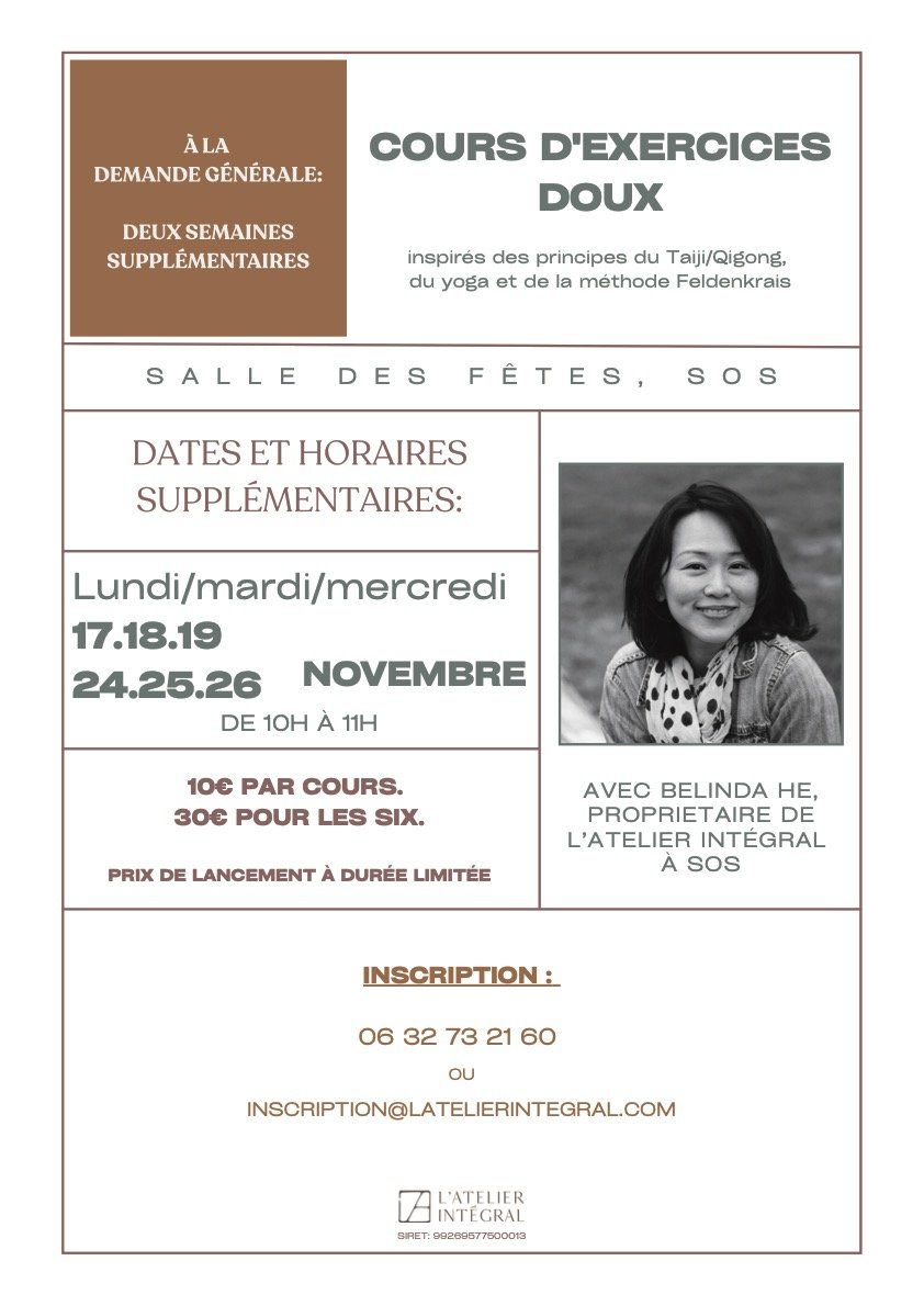 Cours d'exercices doux inspirés des principes du Taiji/Qigong, du yoga et de la méthode Feldenkrais avec Belinda He, propriétaire de L'Atelier Intégral, un studio de danse et de bien-être à Sos.