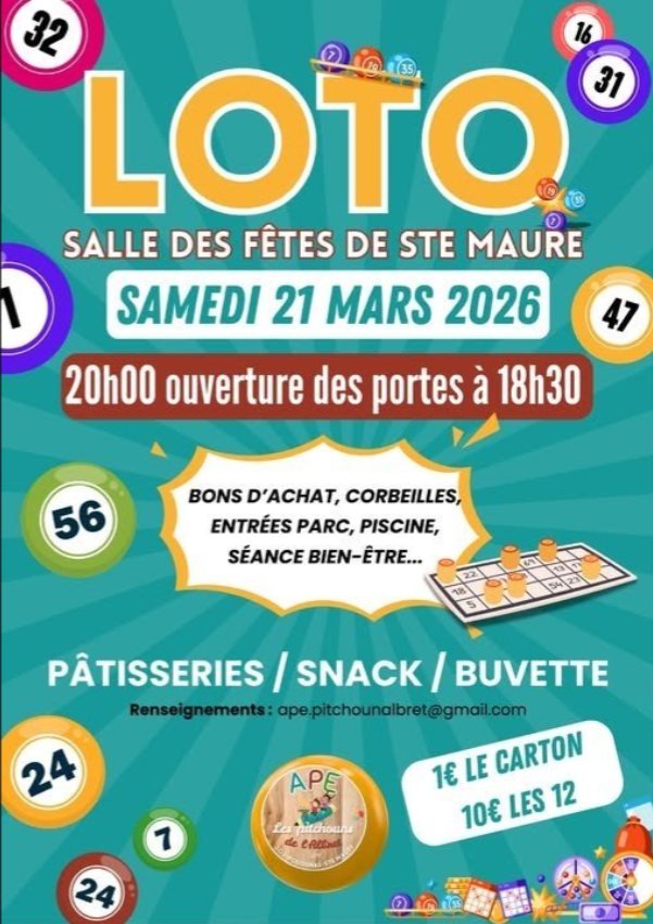 L’APE Les Pitchouns organise son grand Loto le samedi 21 mars 2026 à la Salle des fêtes de Sainte-Maure.